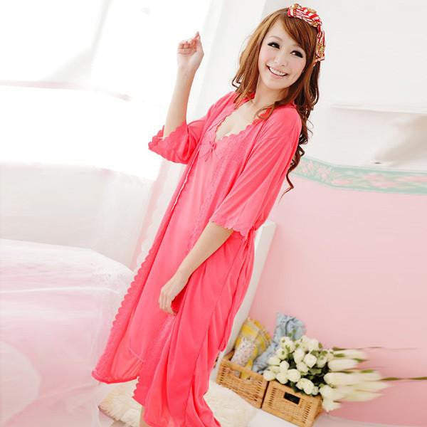 Experience the blend of comfort and style with the Women Sling Lingerie Sleepwear 2pcs sleep Dress Silk Robe Nightgown Nightdress. Treat yourself to this enchanting piece today!
