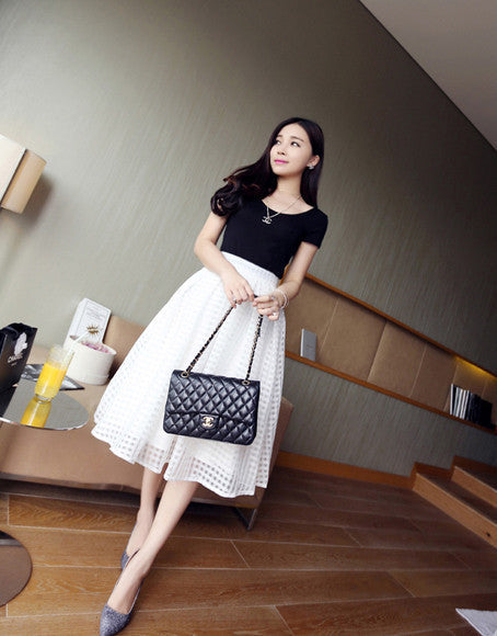Mid-calf, empire waistline, plaid pattern, pleated silhouette, high waist, black and white color variants, polyester, mesh, voile and organza women tutu skirt.