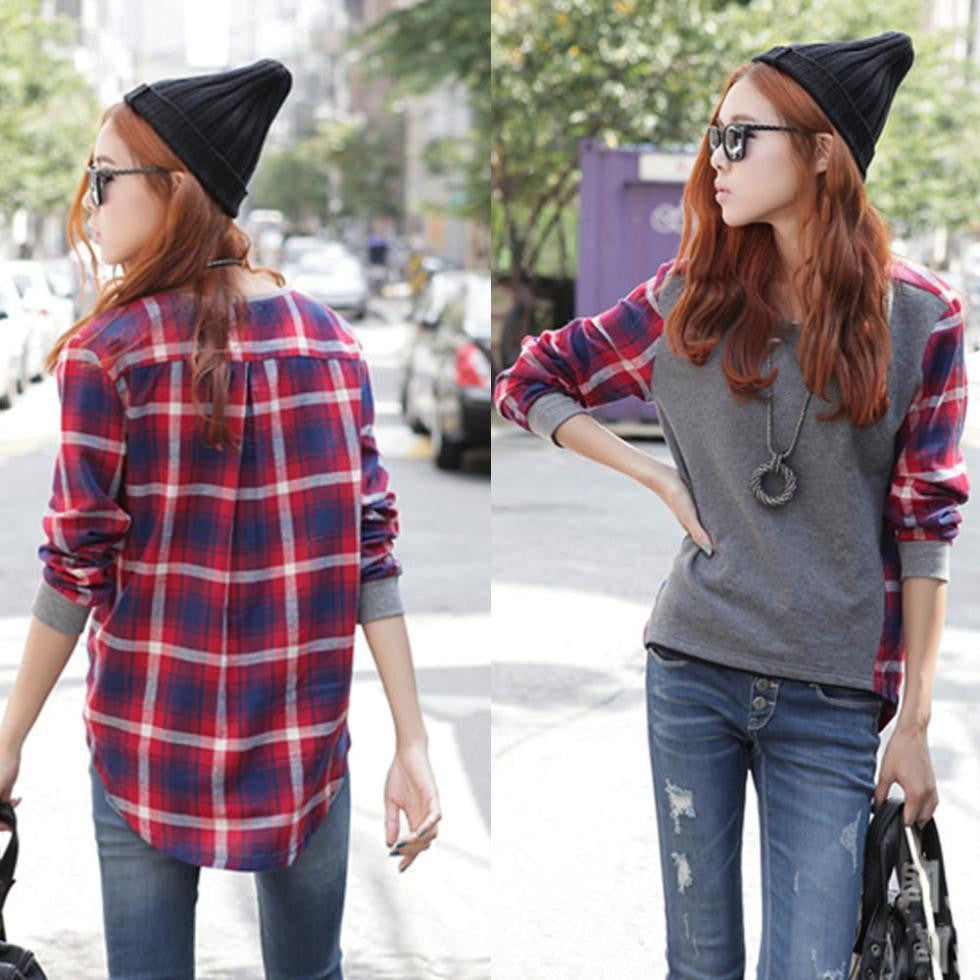 Rock in the long sleeve patchwork blouse with round neck. Get the solid front top and plaid back and look super cool.