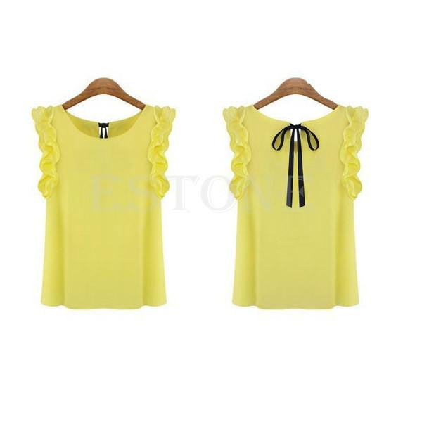 Discover effortless elegance with our Women's Loose Casual Chiffon Sleeveless Tank Tops Blouse, designed for the modern woman who values style and comfort. This chic chiffon top features a unique design highlighted by short ruffle sleeves and a stunning bow at the back, making it the perfect choice for any casual outing or special occasion.