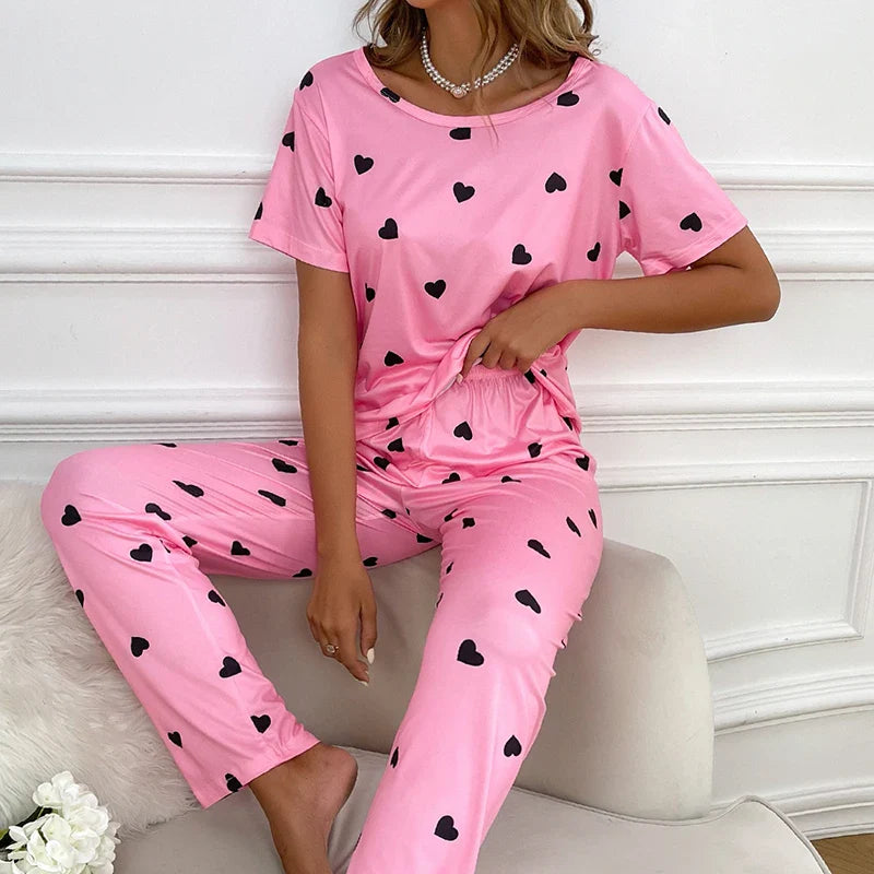 Our Women's Sleepwear Love Printed Short Sleeved T-shirt and Trousers Pajamas Set is not only stylish but also practical, featuring a round neck for easy wear. With a normal thickness, this set is versatile enough for year-round use. Available in various sizes, you can find the perfect fit that hugs your body comfortably without clinging.