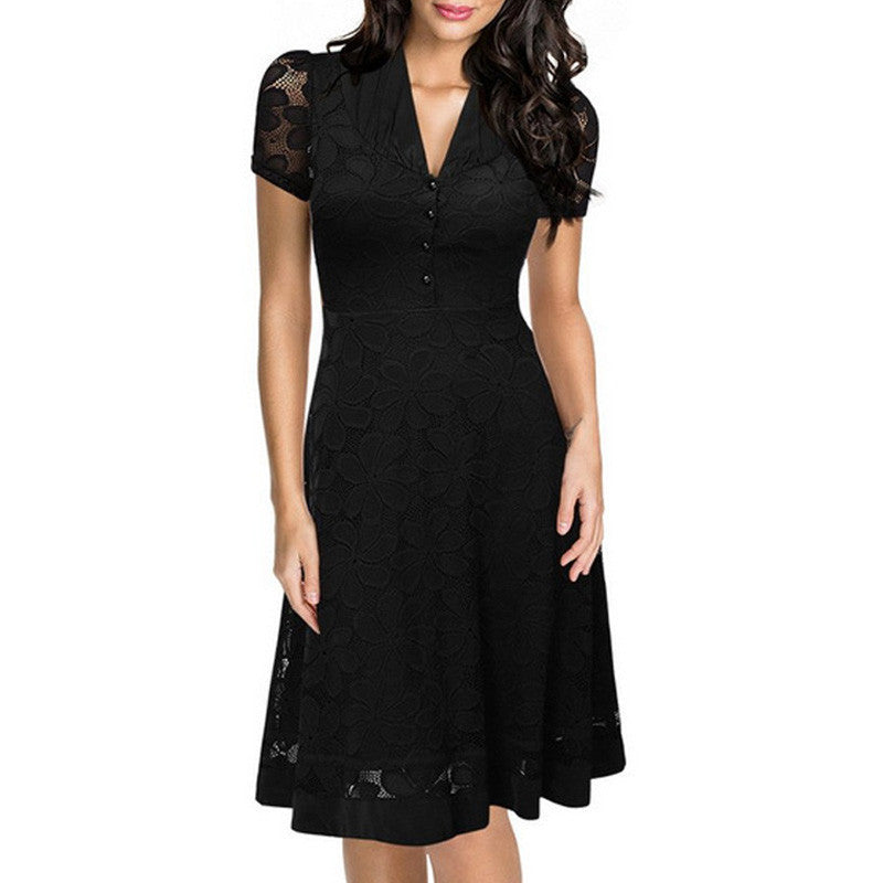 Step into timeless elegance with our Womens Summer Dress Vintage V-Neck Cap Sleeve 1950s Hepburn Style Pin up Rockabilly Party Black Lace A-Line Dresses. Perfectly designed for summer gatherings and evening outings, this stunning dress features a classic vintage-inspired silhouette that flatters all body types. The V-neckline and cap sleeves exude femininity, while the exquisite black lace detailing adds a touch of sophistication.