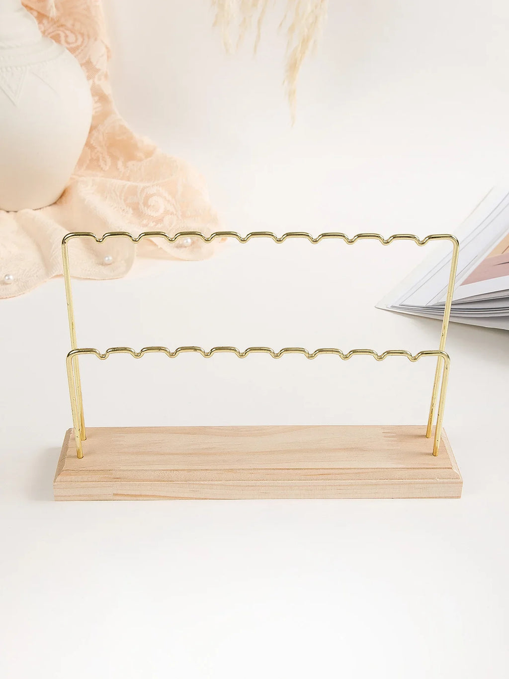 The Double-deck Earrings Ring Necklace Watch Jewelry Shelf Jewelry Stand is crafted from high-quality wood, offering durability and a modern aesthetic that complements any decor. Its sleek lines and contemporary design make it a perfect addition to your dresser, vanity, or retail display.