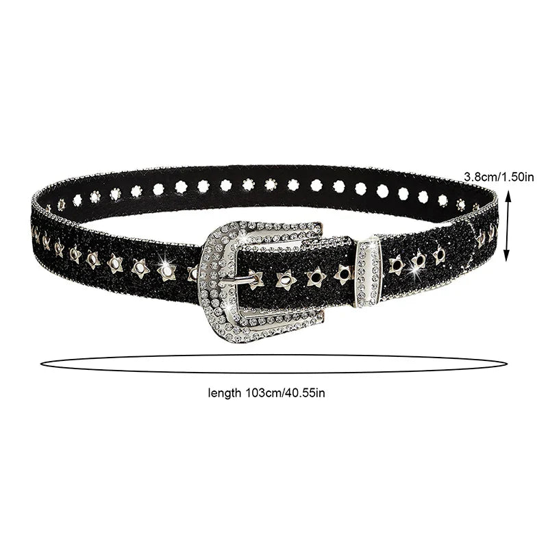 Transform your outfit with the Y2K Rhinestones Buckle Belt Punk Star Hole Waist Strap Gothic Fashion Personality Belt For Cowgirl Skirt Waistband For Women Men. This striking accessory combines edgy punk aesthetics with a hint of western charm, making it a must-have addition to any fashion-forward wardrobe. Crafted from durable PU material, this belt features an eye-catching star buckle encrusted with dazzling rhinestones, perfect for those who dare to stand out.