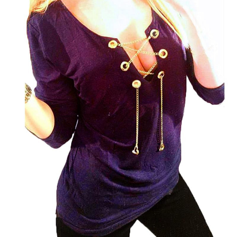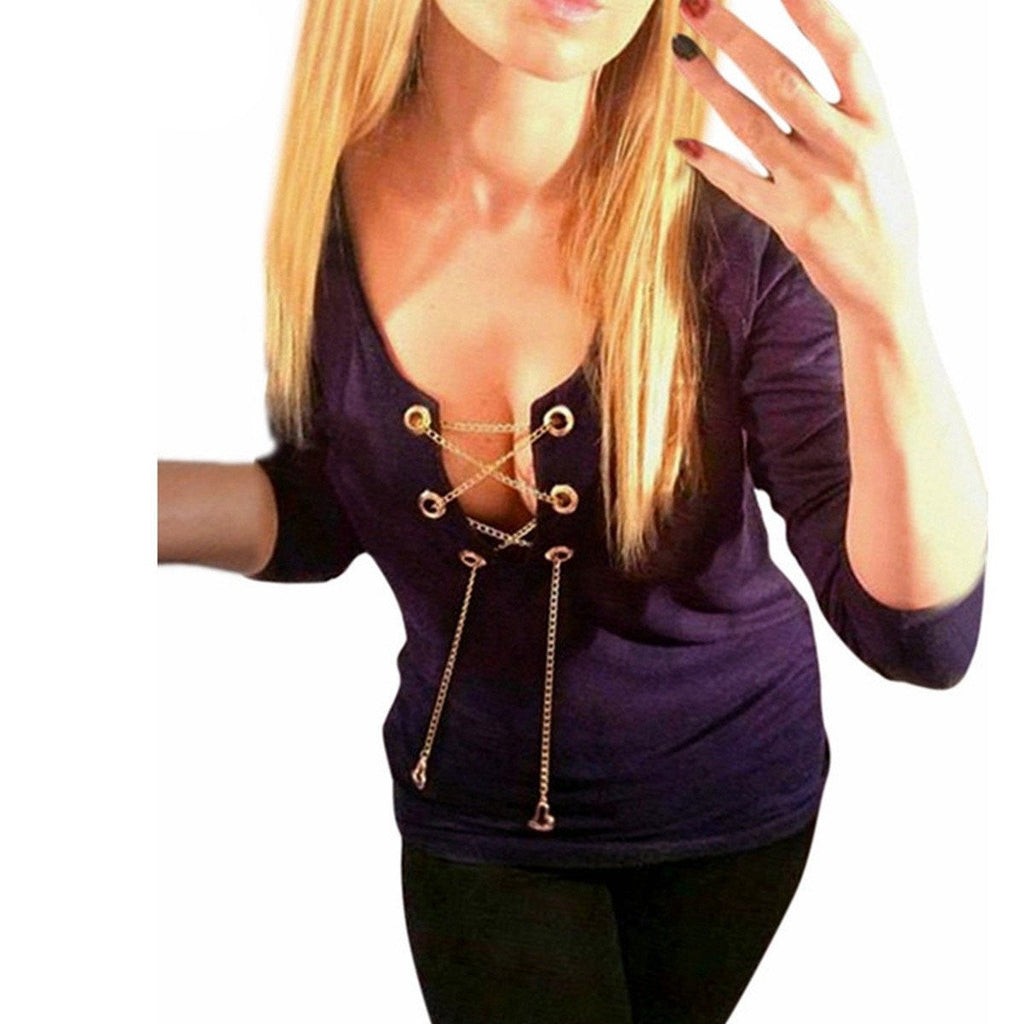 Whether you're dressing up for a night out or relaxing at home, the Women Women Deep V Neck Stretch Metal Chain Cotton Tee Tops Long Sleeve Solid Shirts will keep you looking stylish. With its breathable fabric and chic design, this top is a must-have for any fashion-conscious woman. Don’t miss out on the chance to enhance your wardrobe!