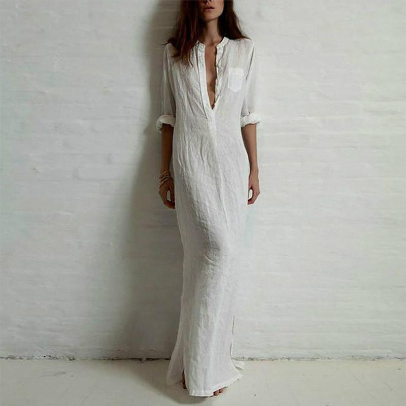 This floor length cotton dress is a great choice for the autumn, get the sexy casual dress with long sleeve and a deep V neckline.