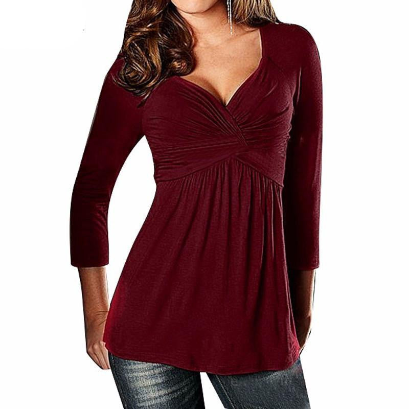 Introducing our stunning Women V Neck Long Sleeve Solid Shirts Elegant Fold Casual Slim Fitted Blouses Plus Size Tee Tops. This exquisite piece is designed to elevate your wardrobe while providing unmatched comfort. Crafted from a premium blend of cotton, polyester, and rayon, these shirts boast a soft and breathable fabric that feels great against your skin, making it perfect for all-day wear.